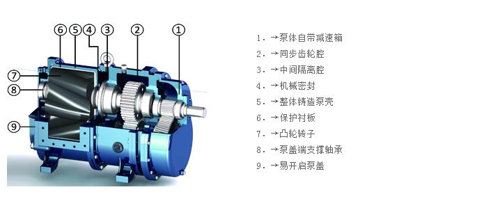 工作原理如下:当动力带动传动轴传递扭矩时,主动轴驱动齿轮箱内的一对同步齿轮及固定在泵轴上的二个转子做相对运动,使泵吸入端产生真空,排出端形成负载压力,来达到输送液体介质的目的。动力机的转向决定了泵输送介质的方向,无正反转之分,在规定的转速范围内泵的流量大小与泵的转速成正比。
